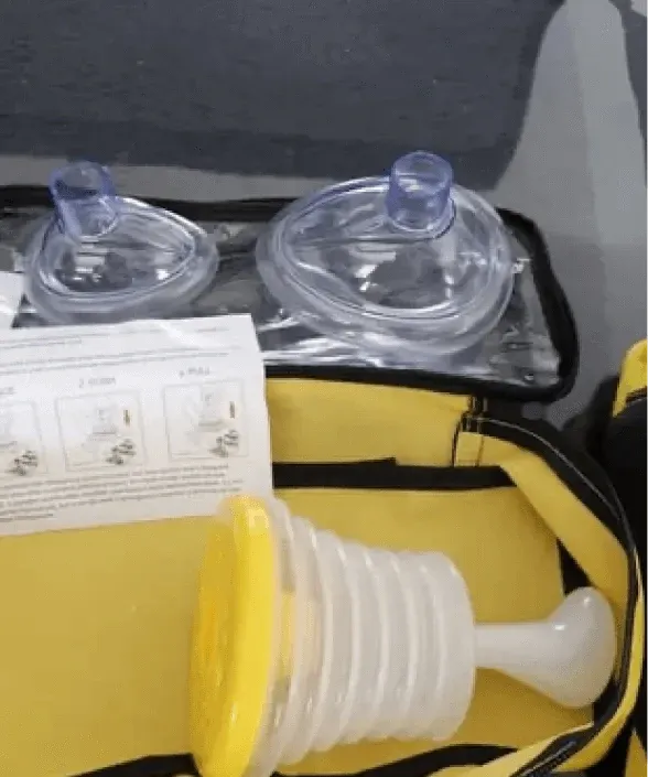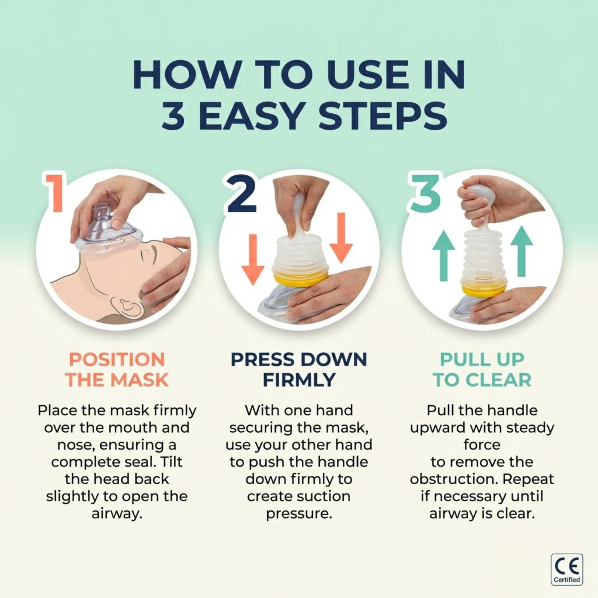 BreathRelief™ uses powerful suction to remove airway blockages in seconds. Simply place the mask over the mouth and nose, push down to compress the device, then pull up sharply to create suction and extract the obstruction.